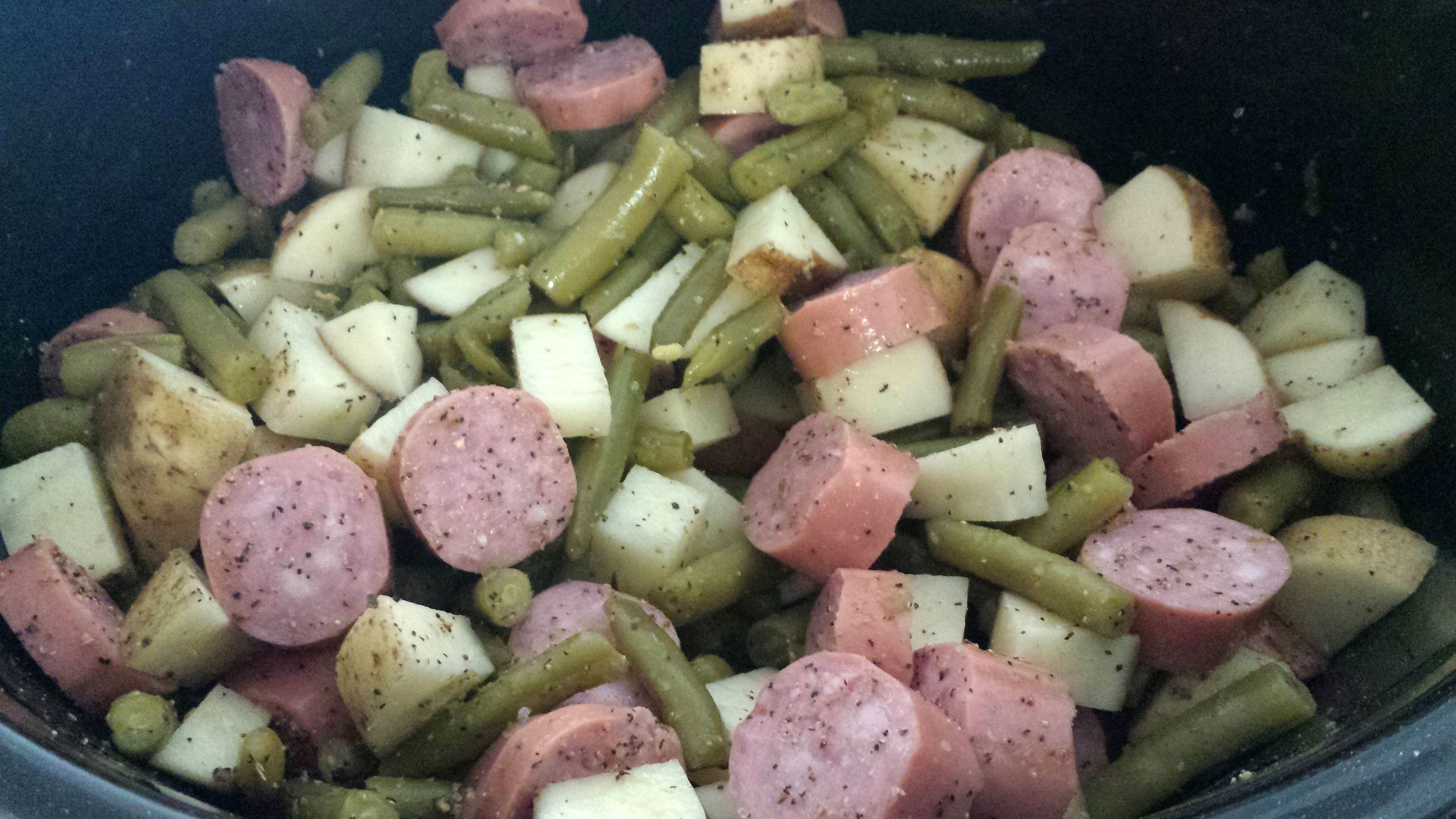 Tonight I made smoked sausage, potatoes and green beans in the crockpot! They were delicious…ask my husband, he had two big helpings!