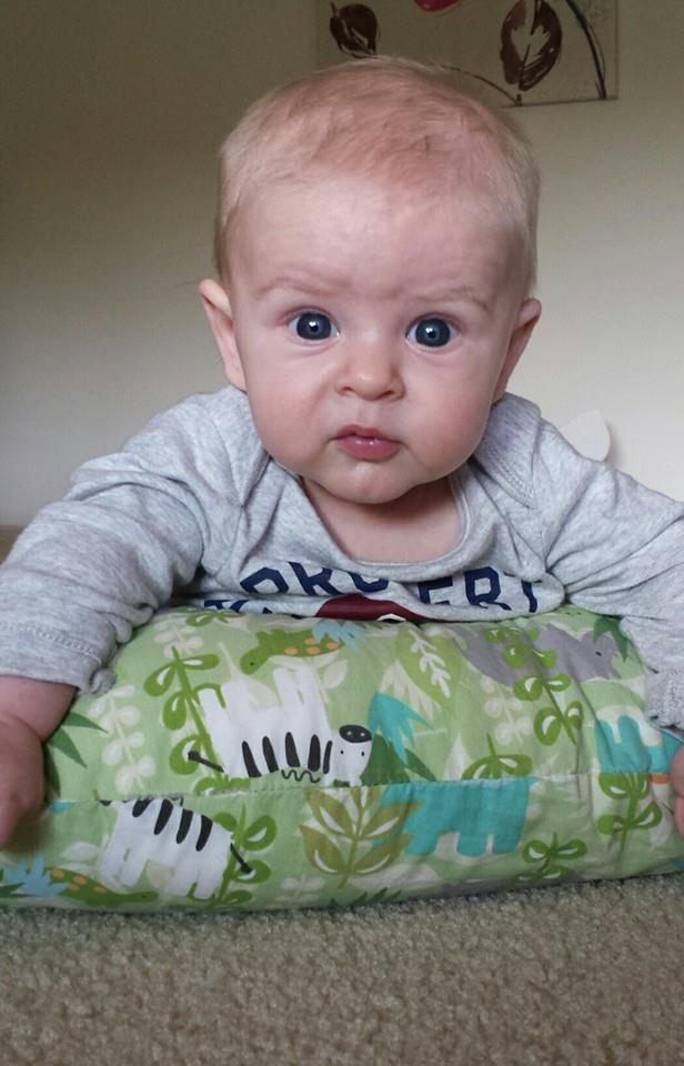 –Tummy time has somewhat always been an issue as he simply does not like laying on his belly. Everyday I give him some time on his belly as he needs it, but lately for a bit each day I also prop him up on the Boppy Pillow on his belly. He is able to raise his head better and it keeps him elevated upright more.