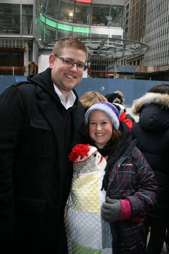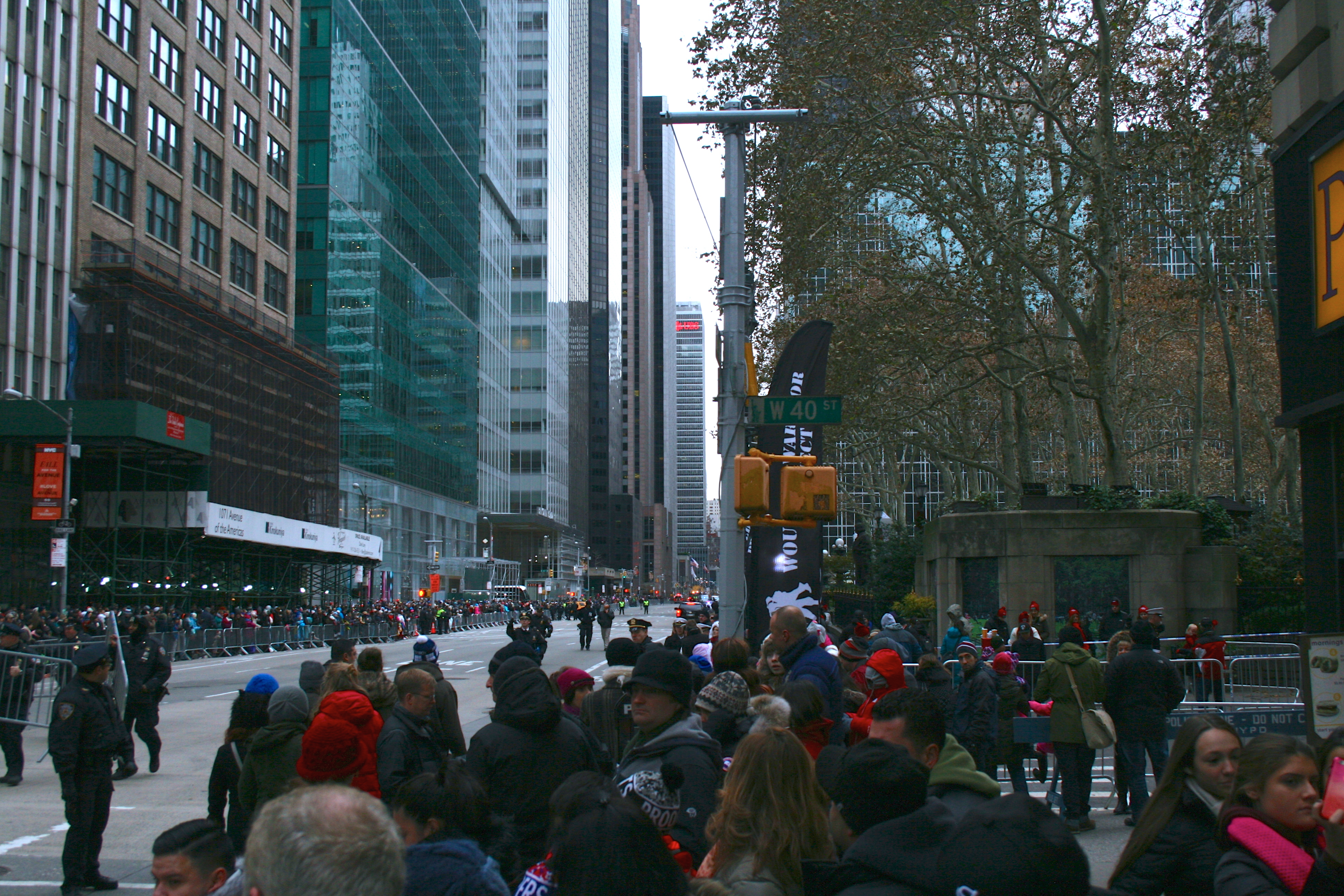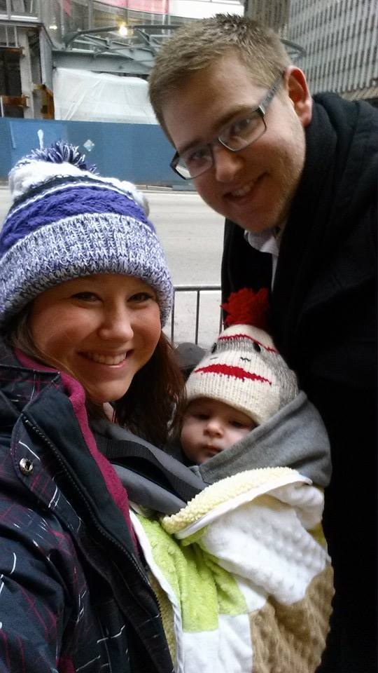 The next morning we got up and bundled up to head out to see the parade. As many of you know the parade starts at 9am on TV, but was not to arrive at where we were located until about 9:30am. We started walking to get a spot at about 8:30am. As we were walking down the sidewalk there were police barricades all down the sidewalk and Brent had mention how packed it was across the street. We assumed we would have to stand up in the terrance across the street from the hotel back a ways from the street. I told Brent that we should just walk up the sidewalk and see if we can get in on our side of the street. There were a couple people who had just walked by the barricades and no one stopped them. As we got closer to the street we noticed a little coffee shop/cafe on the corner. I told Brent that on the other side of the cafe there was a lot of room and we should just walk through and stand there. He said he didn’t think we were allowed to. I said I just saw someone else walk through there no problem. So we gracefully walked in one door of the cafe and exited the other side and just stood on the side walk. Just to our left there was a barricade with tons of people packed shoulder to shoulder and where we were there was lots of room and even people with lawn chairs. Brent looked at me and said I don’t think we are to be here. I told him to not say anything and just stand here. We ended up talking to the guy beside us and he said the area we were in was actually for friends and family of the NYPD. He told us to not say anything and “we were with him.” So yeah, Brent was right. The guy asked us if anyone stopped us and I said no we just walked right in. He told us that your name has to be on a list to stand in that area haha! We were soooo lucky! I was able to go in and get us breakfast and drinks and if we needed to use the bathroom we could just go in the cafe. I also had planned that if Grayson woke up to nurse I would just go in there instead of walk back to the hotel. It was also perfect because every so often I was able to go in and stand to warm up while still being able to see the parade. Grayson was so good for us and slept from 8:30am to 11:30am. We assumed we would have to leave after about an hour and a half because he would wake up and be fussy, but he totally surprised us both. We had a great experience, pretty much front row standing area and the weather was not horrible. Grayson however was so bundled up he was sweating! We had to leave the parade about 20 minutes early so I had time to feed Grayson before we checked out of our hotel, but once we got back home I was able to catch the rerun of the parade on TV and see the end!