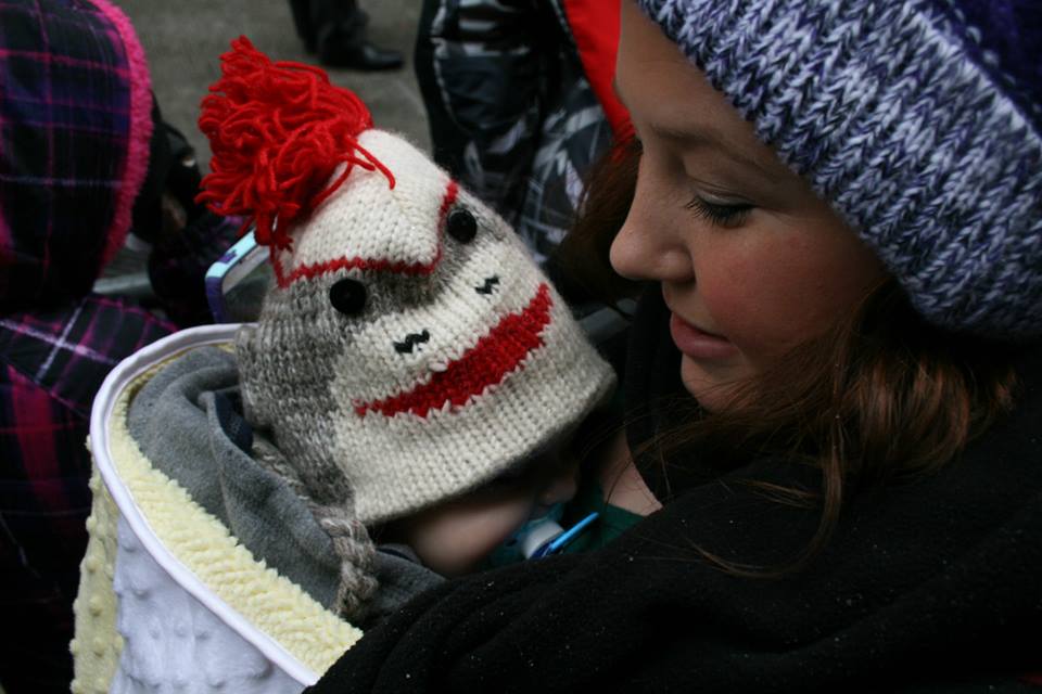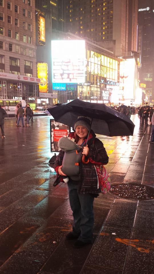 Let me go back a little and tell you about Grayson and I’s experience traveling to NYC to meet Brent that day. So after Brent had confirmed our hotel I was going to meet him in NYC that afternoon. Since he was already there for work I did not want him to travel back home to only have to ride the train back. So I packed a suitcase, yes a suitcase for one night. I got myself and Grayson ready and treked down our three flights of stairs while holding a baby and dragging an overly heavy suitcase; which also was broke. (I could not get the handle up, I rigged it and strapped on an old belt and pulled it by the belt, 🙂 Brent however finally got the handle up once we got there.) Grayson’s carseat was in the car already and I too thought one of his thicker sock hats were in the car. I had to run to the ATM before I caught the train so I wanted to leave in plenty of time. I left at roughly 2:15pm the train was to leave at 3:10pm. We live about 5 minutes from the ATM and train so I wanted to get there early so I had plenty of time to buy a parking space and get parked, get my train ticket and use the bathroom if need be. Well I “knew” Grayson’s hat was in the car so I didn’t even look and I thought I would just grab it when I got to the train station. On our way to the car I had just covered him up with a blanket. So I arrive at the train station, get Grayson put in the front carrier as it is sleeting and windy and rainy and just pure nasty. I wore boots so my feet would stay warm but that was not how it turned out to be. There was so much slush and water on the ground my boots were soaked, my socks were soaked, the bottom five inches of my pants were soaked along with my hair and the suitcase. Once I got Grayson in the carrier I began looking for his hat and I could not find his sock hat anywhere. I looked up front, in the back and on the floor and the hat, or any hat at that was not found. I was like you have got to be kidding me. I feel like a horrible parent. I left the house without a hat for my child. We are going to NYC to see the parade, it’s going to be chilly and my child does not have a hat.