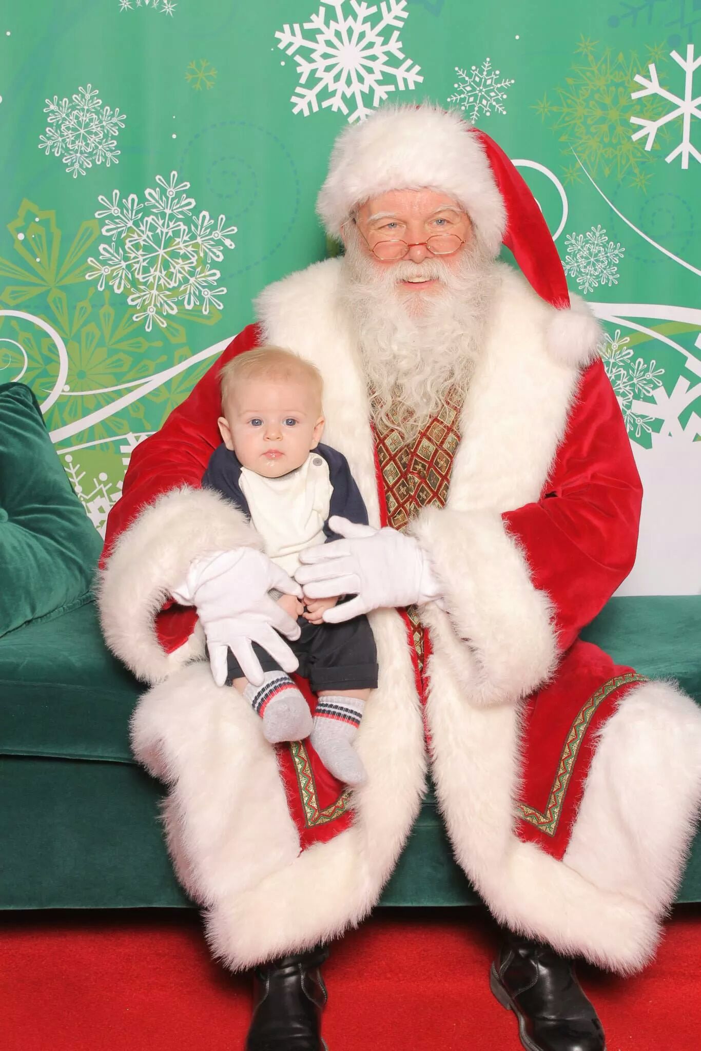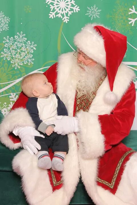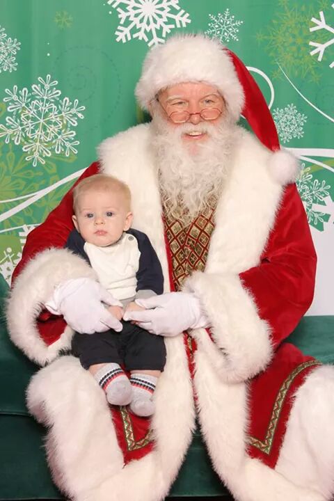 This weekend we started our first tradition of taking Grayson to see Santa. It was seriously the cutest thing I have ever seen. We had to wait in line about an hour at our local mall and as we waited I was expecting Grayson to get ansy. He whimpered a few times, but did exceptionally well. As we made our way up the line and Grayson being so well behaved I expected him to start crying as our turn approached. To my surprise however he did fabulous. Brent sat him on Santa’s lap and then we both stood back and tried to get his attention to see if he would smile. He had absolutely no idea what was going on and just sat there so sweet and innocently. He even looked Santa straight in the eyes. (I wish I knew what he was thinking!) There were no tears shed and we got the cutest “1st time seeing Santa pictures!”