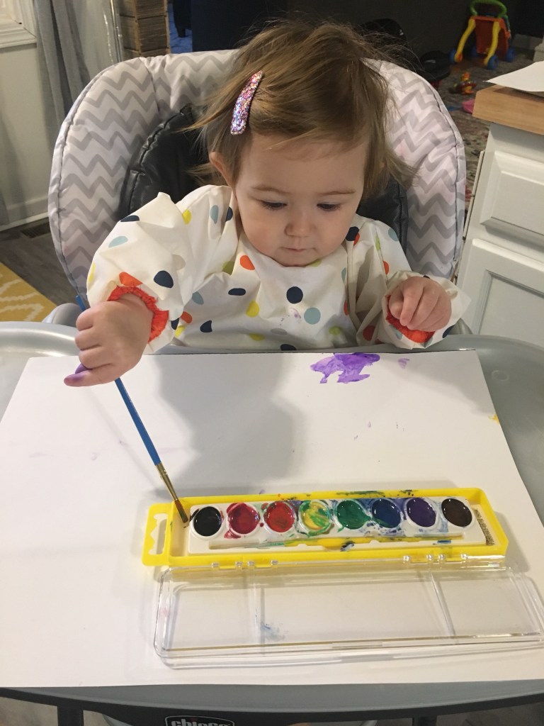 We also tried watercolors for the first time! I haven’t painted with watercolors since elementary school. I even enjoyed painting with these again. I continued to wet the paints for her so we didn’t have a cup of water spilling everywhere.
