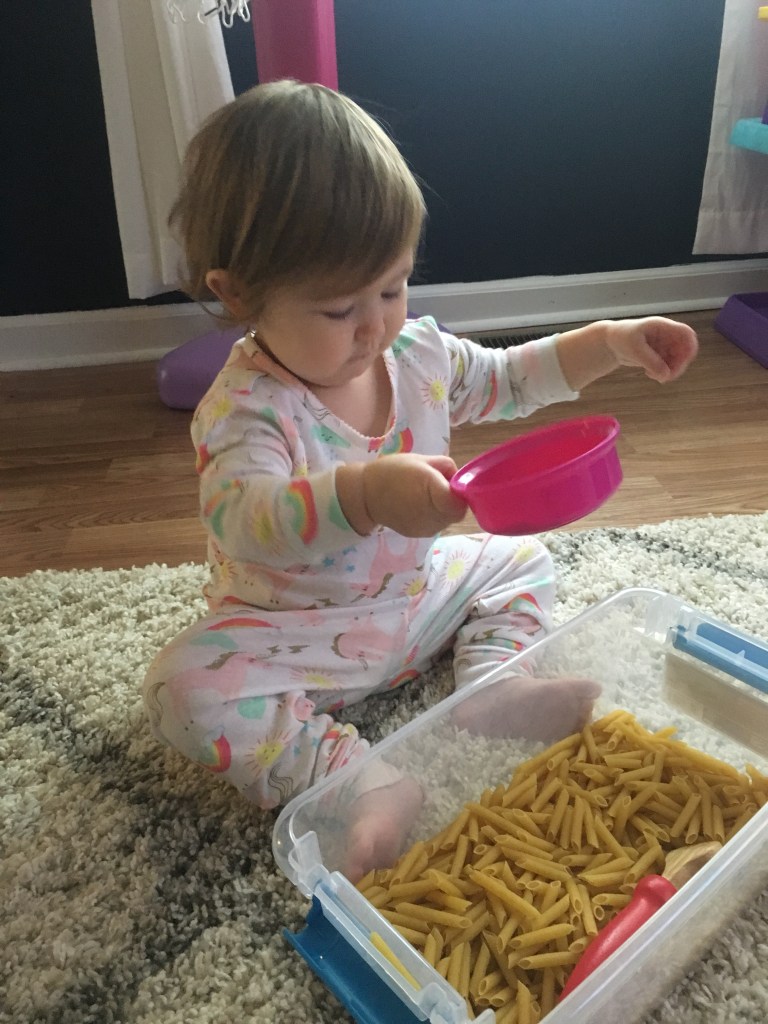 Pasta sensory box- 1 box of penne pasta and a few different “play kitchen” utensils a cheap and fun activity for little ones. This is one you will have to watch closely as well, Graysie tried sticking a few pieces of pasta in her mouth. These will probably end up out of the tub as it did with us, but she enjoyed it!
