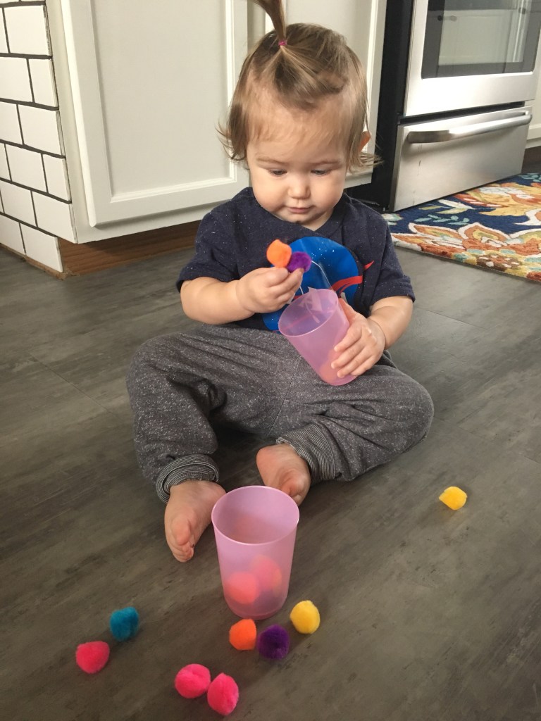 We used these pom pom balls to also practice picking up and putting in a small cup then taking them out and placing in a second cup. It doesn’t take much to entertain a little one.
