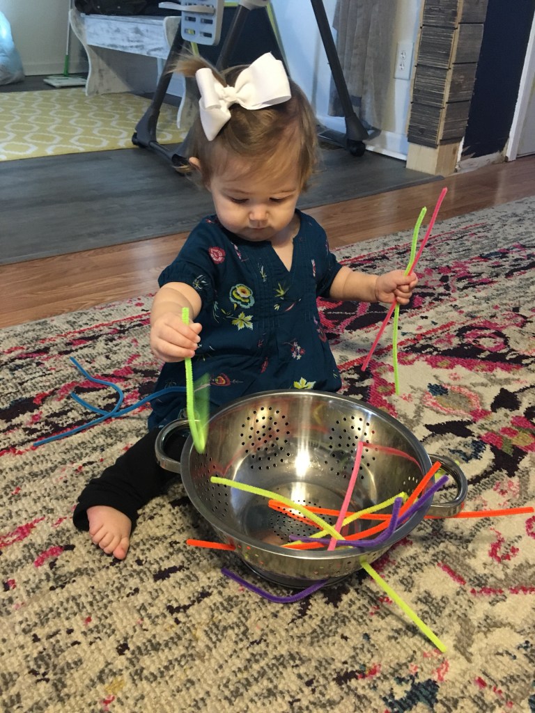 Pipe Cleaner and Colander- This little activity helps with hand and eye coordination. Graysie doesn’t quite get it just yet, but show your little ones to stick the pipe cleaner through the small holes.