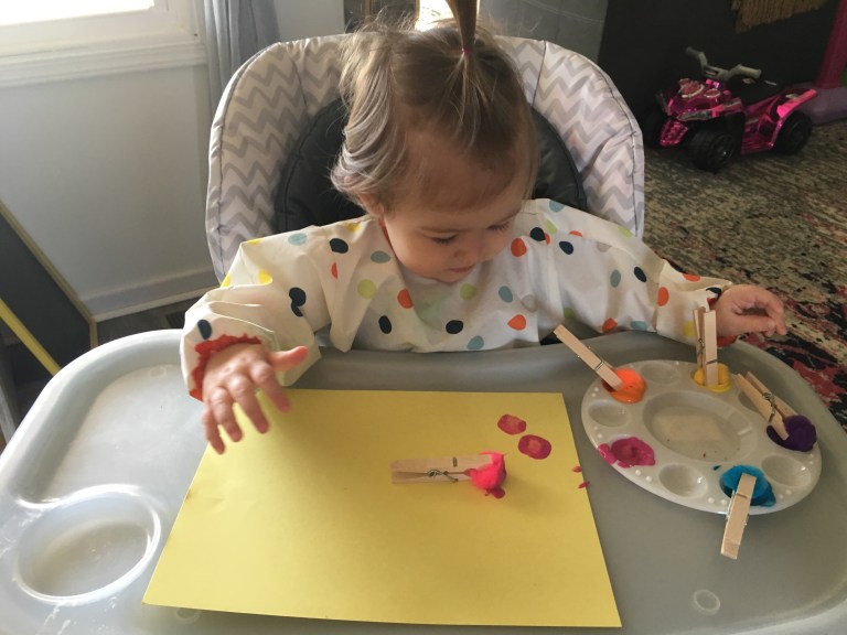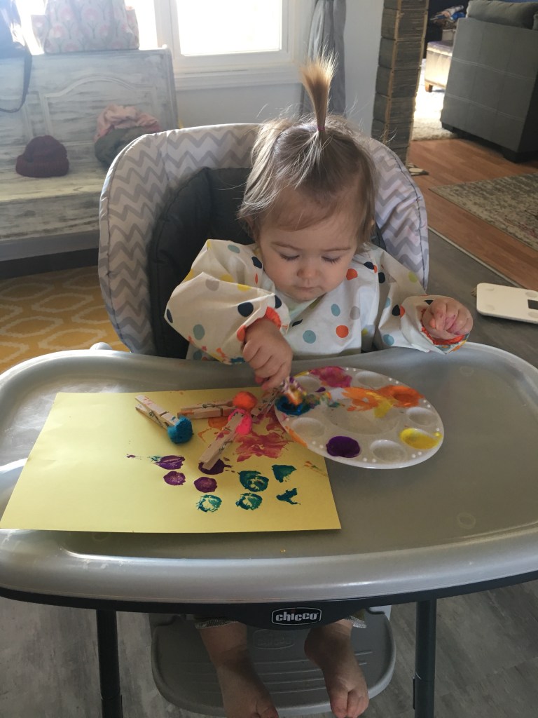 Pom Pom Painting with Clothes Pins- A neat way to mix up painting by using something other than your fingers and a brush. We clipped the balls in the clothes pin and I matched them to paint colors we had. She of course didn’t dip them in the right color, but it’s always good to start showing children little things like this. Repetition is the best way for them to learn. I would say the colors out loud as she picked them up and I would help her here and there to try to dip in the correct color.