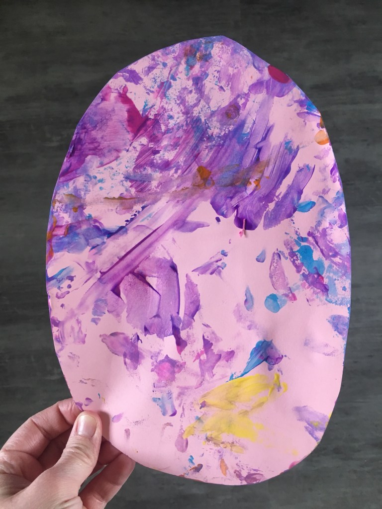 Egg Painting with Potatoes- I cut craft paper into the shape of an egg and then washed and cut a potato in half. I carved out straight lines in each potato halve to give it the design of a decorative Easter egg.