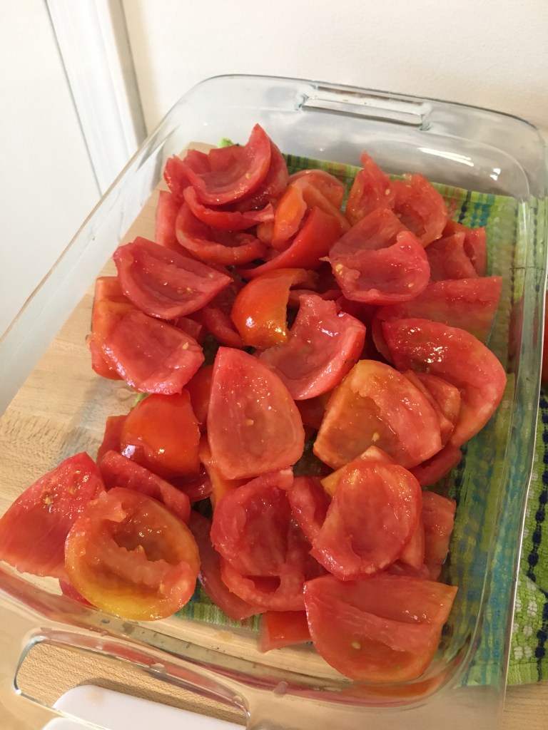You’ll see below I had my discard pile, my 13×9 with the quartered tomatoes and my bowl with the seeds and and insides.