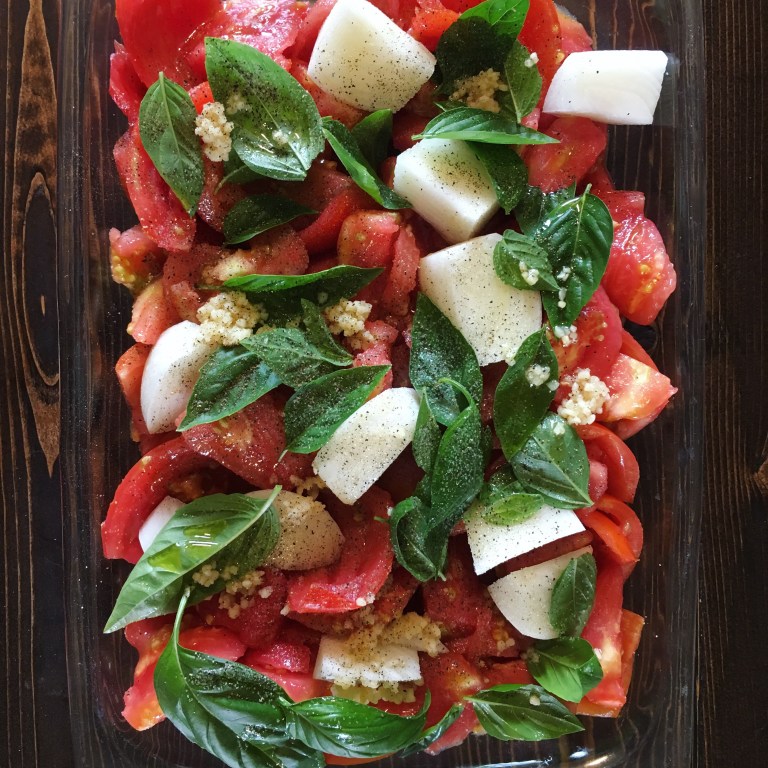 Next cut up a medium sized onion (I quartered my onion), 4-5 garlic cloves and a handful of basil and place on top of the tomatoes. My garlic bulb was bad so I had minced garlic in the fridge and I added roughly 2.5-3 tsp of the garlic. As for the basil, we like basil so I added a generous amount. Add as little or as much as you’d like.