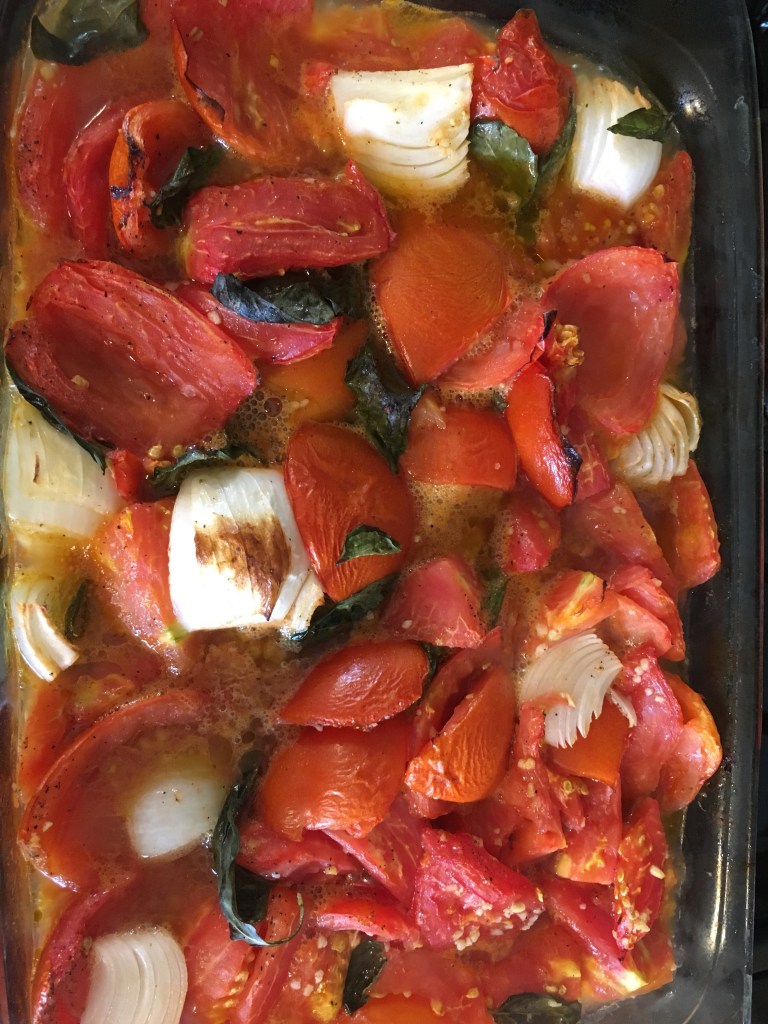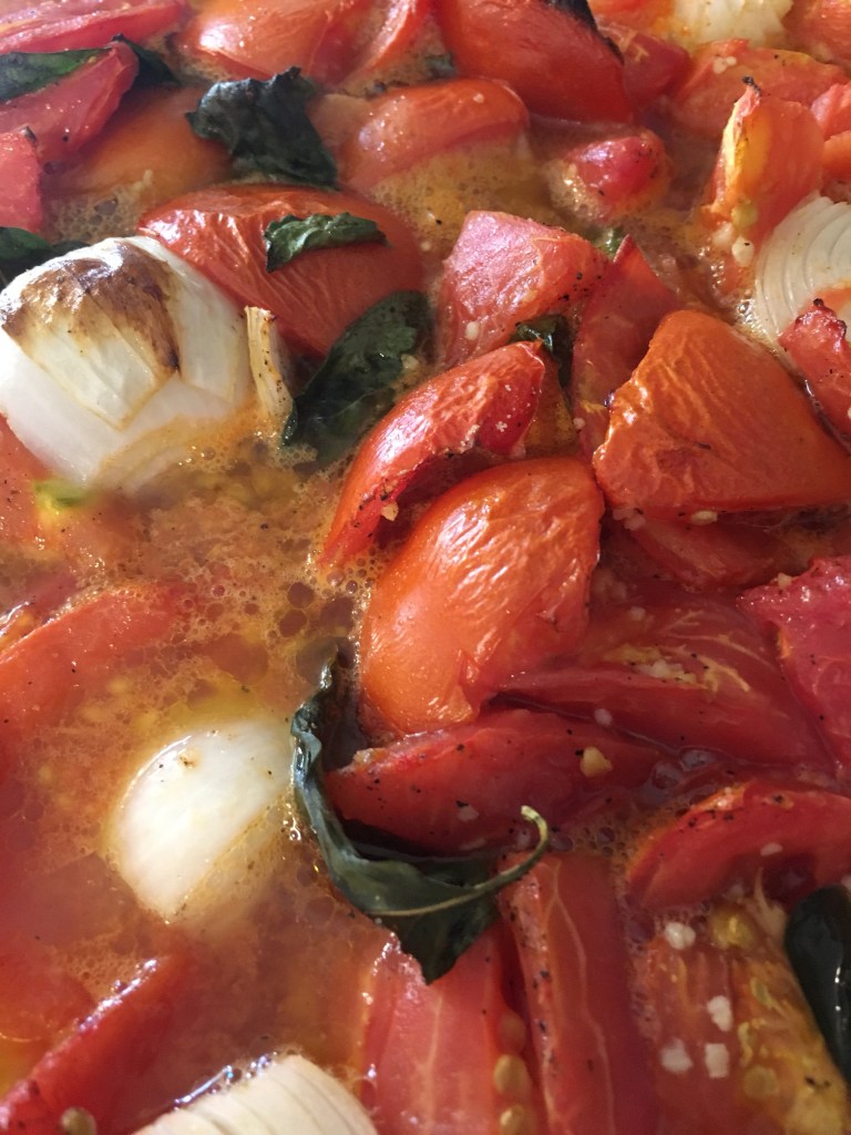 The bowl with the juices and seeds I went ahead and just dumped into the 13×9. You can do this either way. If you discard the seeds just press the tomatoes into a small strainer and pour the juices over the tomatoes. You’ll want some liquid over the tomatoes so they don’t burn to the bottom of your pan.
