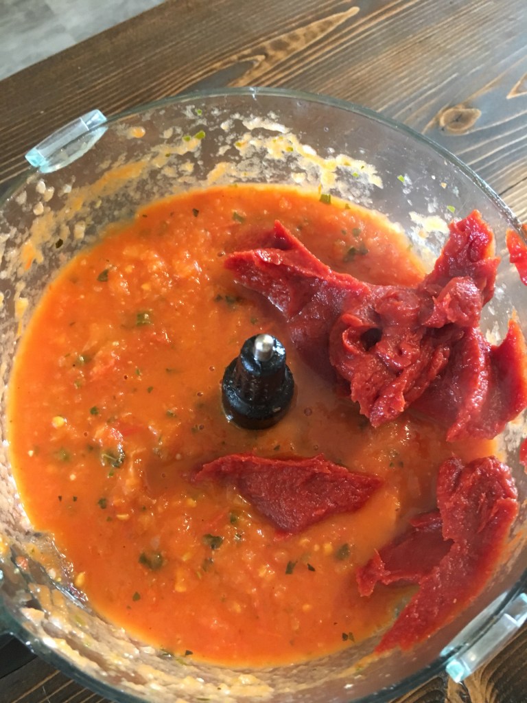I then blended the mixture for a good amount of time until everything was pretty blended up. I took a look and once pretty smooth I added one small can of tomato paste and about a tsp or so of red wine vinegar. You can use balsamic vinegar or probably any vinegar if you wish depending on taste.