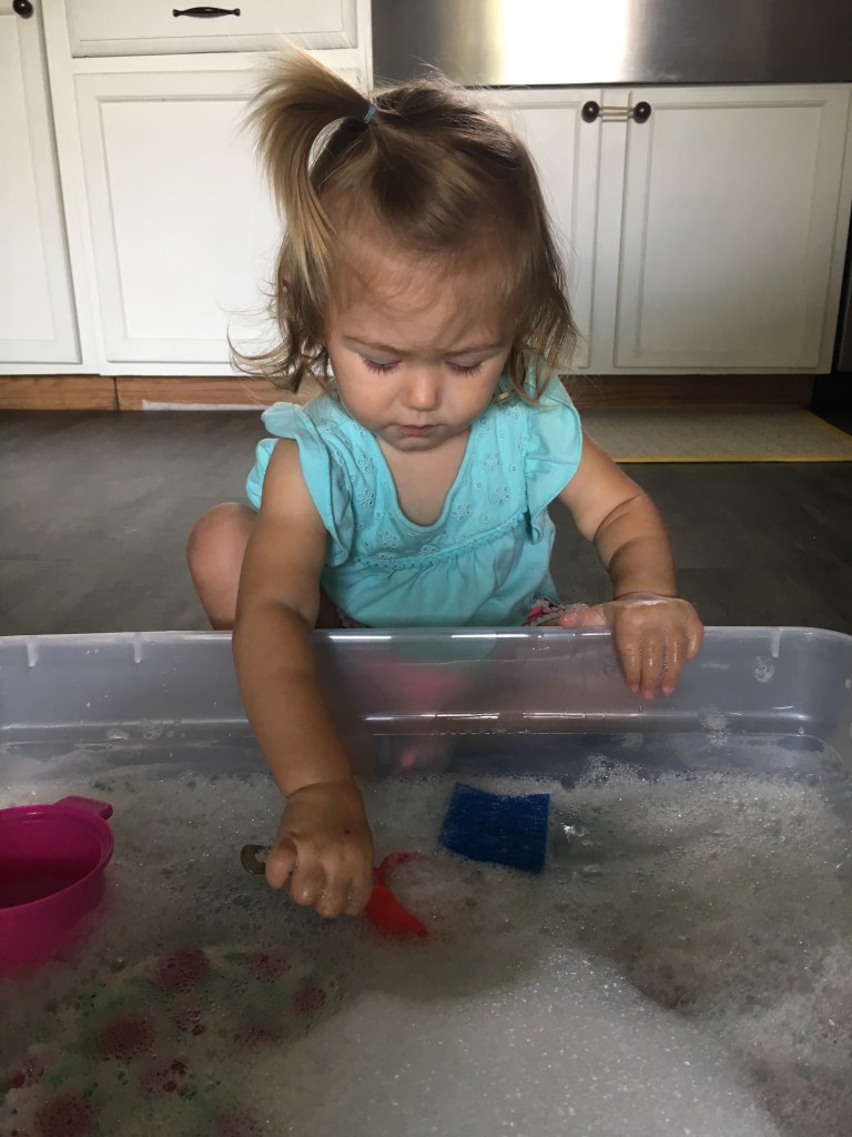 For our sensory bin, I gave Graysie 2 measuring cups, 2 kids play plates, one of her play kitchen pans and half of new sponge I cut in a tub filled with water and some dish soap. What kid doesn’t love bubbles!